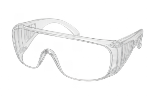 Clear safety goggles with adjustable strap for eye protection, ideal for laboratory, construction, and industrial use.