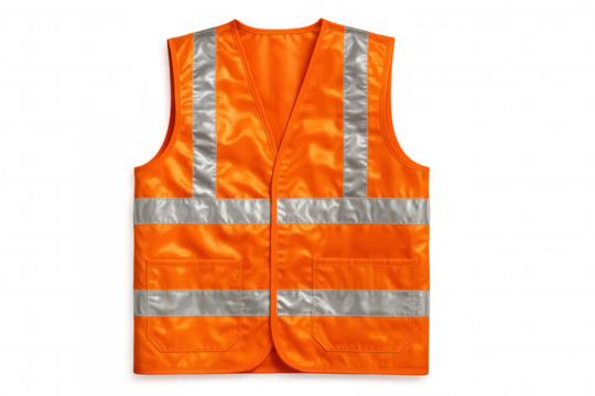 Safety vest with bright orange fabric and reflective silver stripes, highlighting worker protection during low-light industrial and construction scenarios, transparent backdrop
