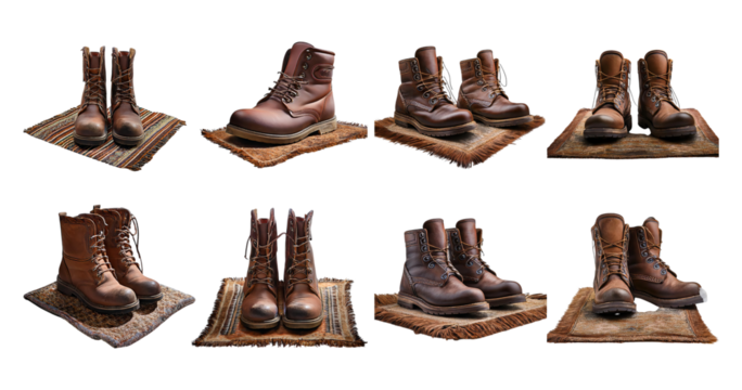 Collection of Stylish Brown Leather Boots on Textured Mats, PNG bundle collection, Isolated on Transparent Background