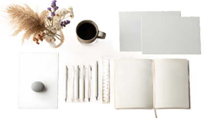 Minimalist top-down view of an authentic designer's workspace featuring high-quality aesthetic stationery and premium creative tools for professional graphic design projects PNG on a transparent