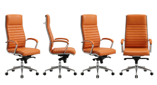 Set of four ergonomic office chairs with adjustable height and swivel base isolated transparent