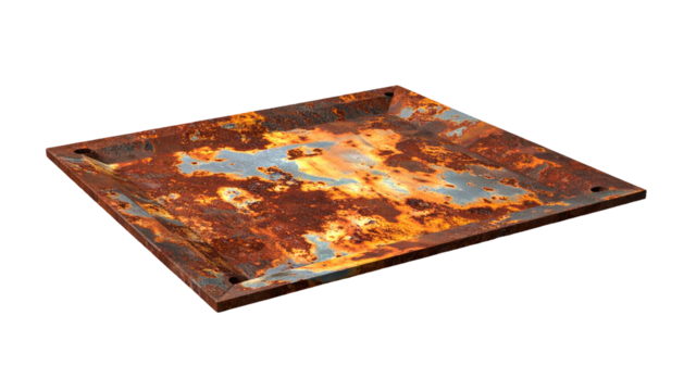 Rectangular rusty metal plate with bolts around the edges, isolated on black