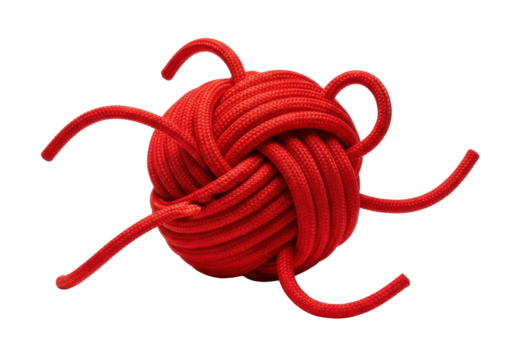 A spherical red nylon rope knot, intricately woven with extending strands on a transparent studio background with shadows, concept of complexity and problem-solving