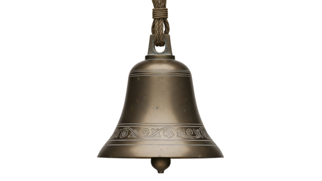 Detailed closeup of an antique brass cowbell hanging from a thick woven rope loop with intricate decorative engravings around its flared lip against a stark black background.