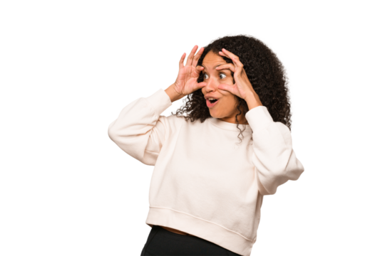 Young african american curly woman isolated keeping eyes opened to find a success opportunity.