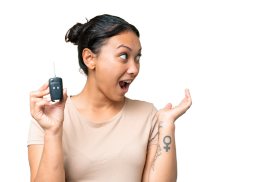 Young Uruguayan woman holding car keys over isolated chroma key background with surprise facial expression