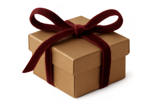 Small brown cardboard gift box wrapped with a dark red velvet ribbon and bow, representing celebration and presents. Transparent background