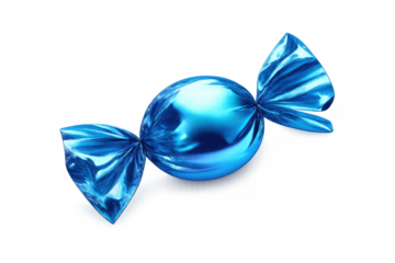 Blue wrapped candy. Glossy sweet treat in metallic crinkled foil. Delicious confectionery packaging