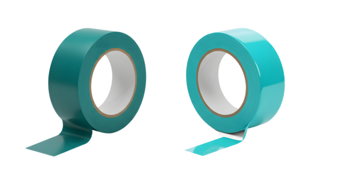 Two rolls of teal adhesive tape with loose ends isolated on white background, useful for packaging and crafts