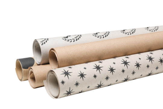 Golden-star patterned wrapping paper roll resting on verdant background, providing festive packaging solution with transparent surround
