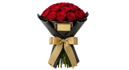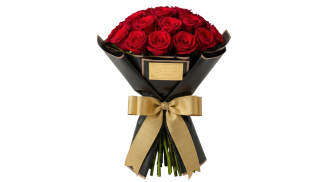 A wrapped Christmas gift with a shiny red bow and festive wrapping paper, isolated on a transparent background, with a gift tag attached