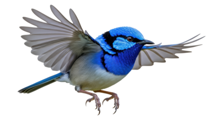 Blue splendid fairy wren bird spreads its wingst on transparent