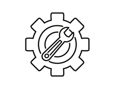 Two interlocking blue gears with a silver wrench on top isolated on transparent background