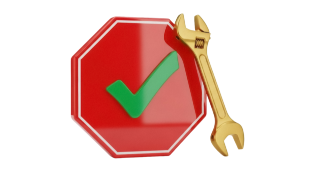Isolated Octagon sign with green check mark indicating approval and a gold wrench tool