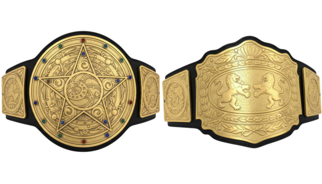 A closeup of a golden championship belt with a prominent star and intricate detailing, isolated on a transparent background
