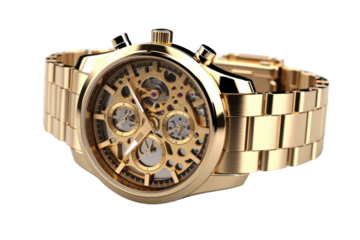 Gleaming Elegance: A Timeless Gold Watch. On a White or Clear Surface PNG Transparent Background.