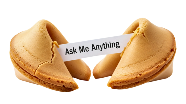 A close-up shot of two fortune cookies, one open revealing a strip of paper with Ask Me Anything written on it transparent background