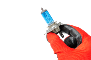 gloved hand holding Halogen car lamp, car light, car headlight isolated on white background