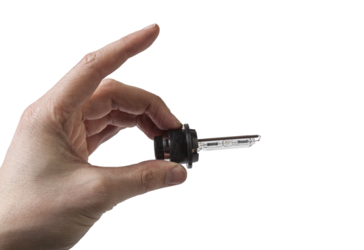 Automotive electric parts - New white 12v xenon headlight car lamp on the white background - gas discharge lamp. Spare parts auto catalog.