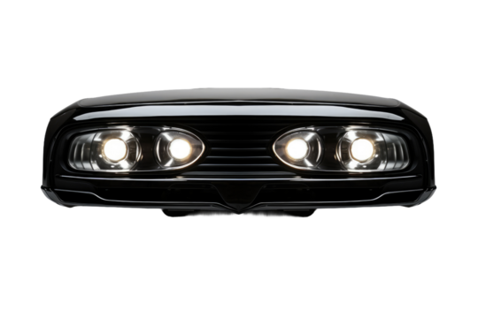 Close-up shot of a sleek car headlight, perfect for automotive or design projects, isolated on black.