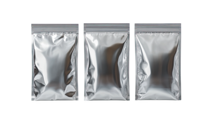 Three shiny silver packaging bags, perfect for storing snacks, herbs or food items with a clean and modern look.
