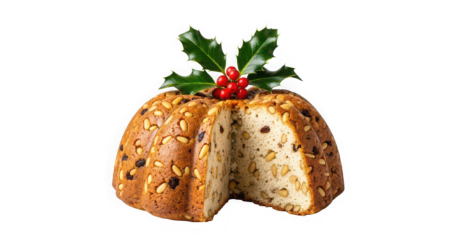 Festive christmas fruitcake with holly and berries