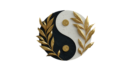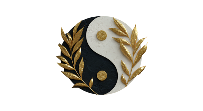 A textured, three-dimensional Yin and Yang symbol adorned with golden leaf branches