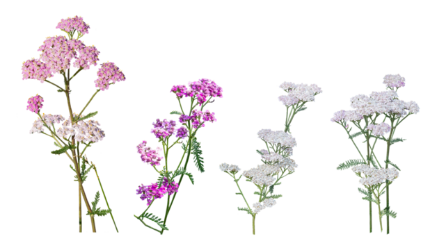 Common yarrows, achillea millefolium, red pink white, isolated on a transparent background