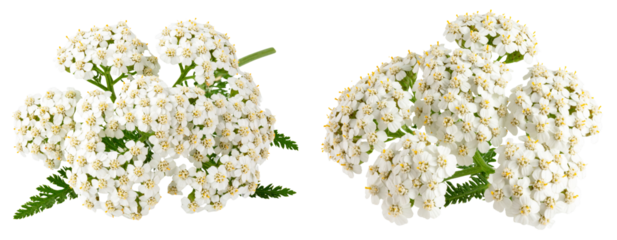 Elegant clusters of white yarrow flowers with delicate green leaves, isolated on a white background.