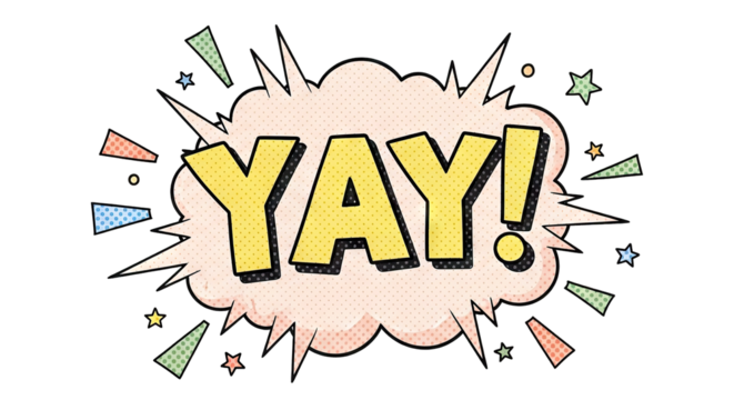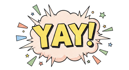 Yay word in comic speech bubble with colorful confetti.