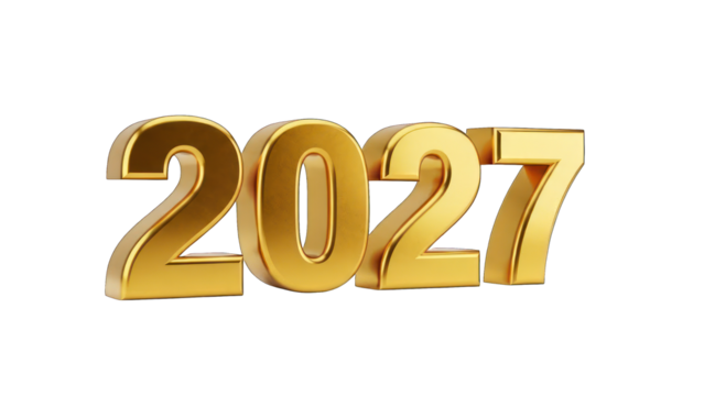 Shiny gold 3D render of the year "2027" floating against a black background