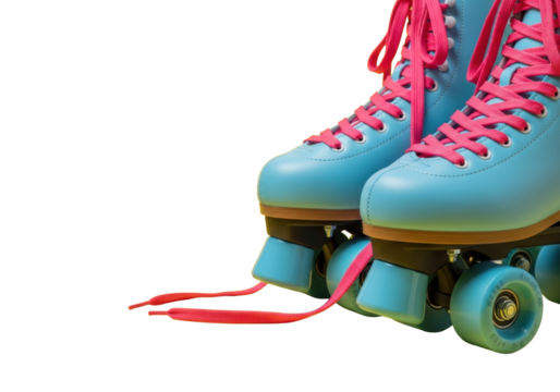 Pair of vibrant light blue retro roller skates with bright pink untied laces on a clean seamless bright yellow background, studio shot. Nostalgic playful fun and active lifestyle concept