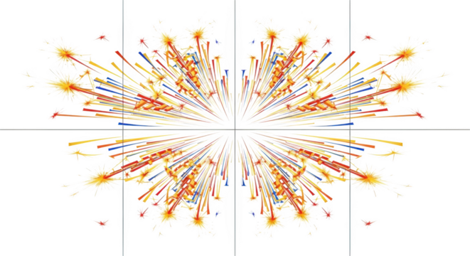 Symmetrical burst of yellow orange red blue sparks and starbursts on png isolated transparent background black background