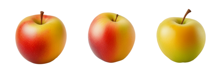 A fresh group of ripe red and yellow apples with water droplets isolated on transparent background