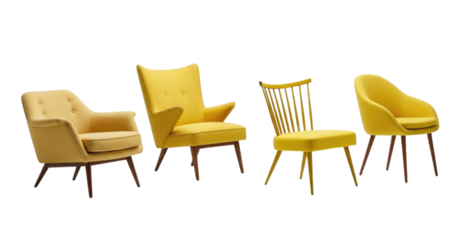 A set of four yellow velvet armchairs isolated on transparent background, showcasing modern design and comfortable seating for interior decor