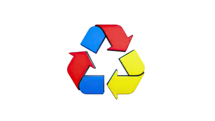 Three-dimensional recycling symbol in red, blue, and yellow