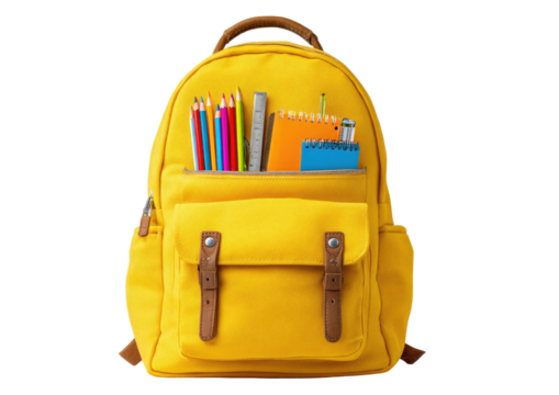 A yellow backpack isolated on white transparent background, PNG File. Perfect for clipart