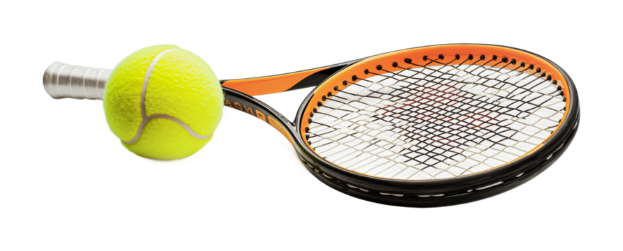 Bright yellow tennis ball with a racket ready for a game on a sunny day outdoors, cut out