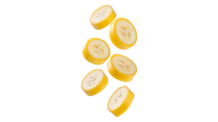 Six perfectly cut, bright yellow banana slices are dynamically falling through the air on transparent background