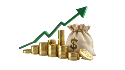 A stack of gold coins with green arrows pointing upwards, symbolizing financial growth and stock market rise