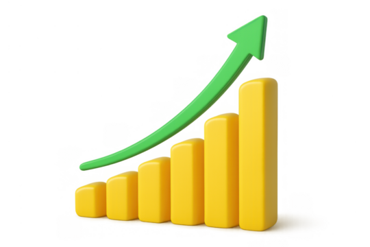 Yellow arrow and bar graph icon symbolizing growth and progress on transparent background