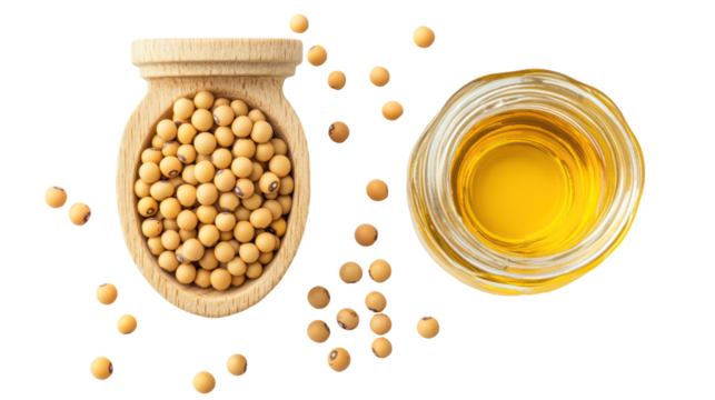 Soybeans in a wooden bowl and soybean oil isolated on transparent background