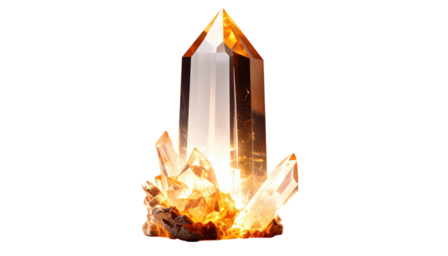A gleaming, tall, orange-yellow crystal formation, with sharp edges, resting on a rough, textured base