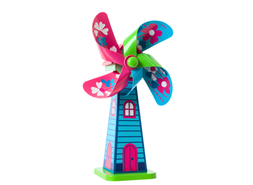 Colorful pinwheel toy with red blue and yellow petals isolated on transparent background