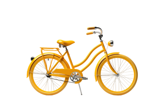 Yellow bicycle, side view. Black leather saddle and handles. Png clipart isolated on transparent background