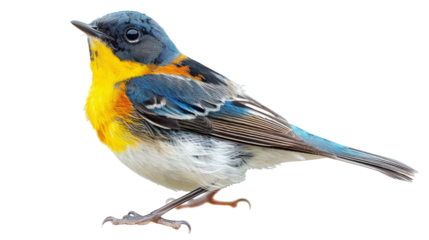 A large black and yellow bird with a long beak stands on a white background, cut out - stock png.