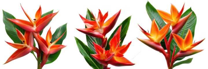 Bird of Paradise Flowers, Vibrant orange and yellow bird of paradise flowers with lush green leaves, Tropical Splendor, Exotic Flora on a transparent background.