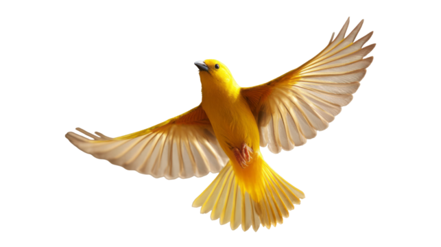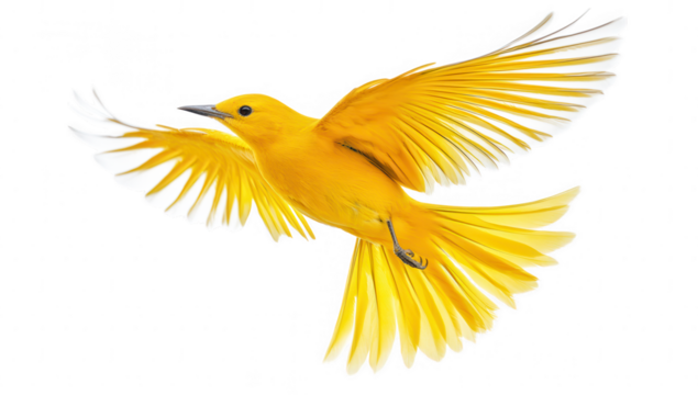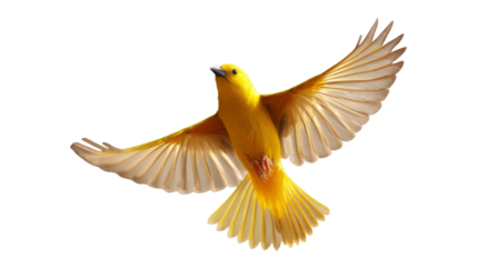a vibrant yellow bird in mid-flight showcasing its striking feathers against a white background. beauty and grace of the bird emphasizing its lively colors and dynamic movement