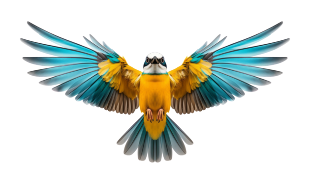blue and yellow bird flying isolated on transparent background cutout