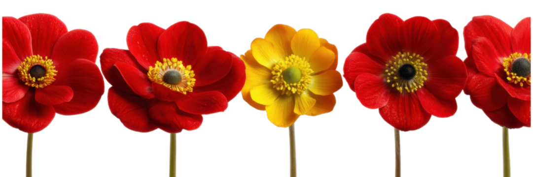 Row of Identical Red Anemone Flowers with One Yellow Bloom